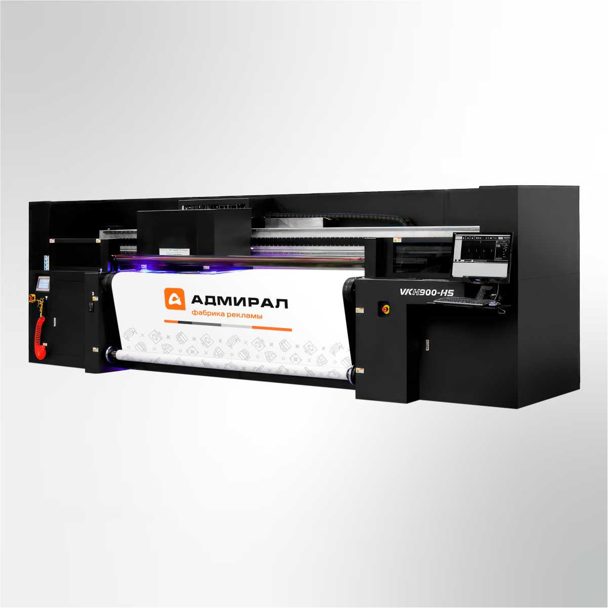УФ широкоформатный принтер шириной 3.2м . Данный УФ принтер поззволяет нам печатать на любых рулонных материалах в том числе на тяжёлых тентовых тканях весом до 900гр\м2.